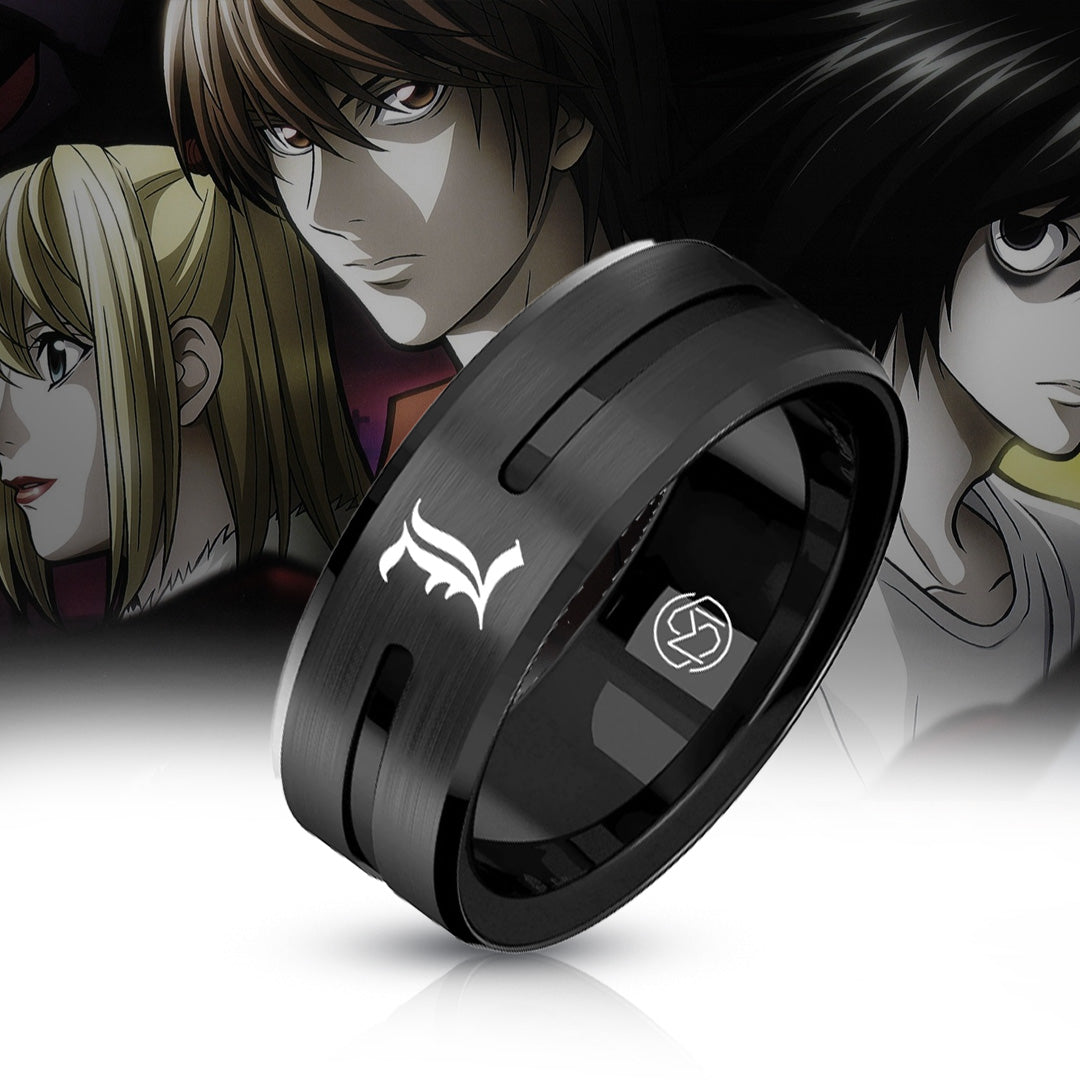 Represent the best strategy anime with our exclusive Death Note ring, a tribute to the brilliant detective and enigmatic character, L. Crafted with meticulous attention to detail, this limited edition ring is forged from pure tungsten carbide, featuring a sleek black exterior with a distinctive middle groove.