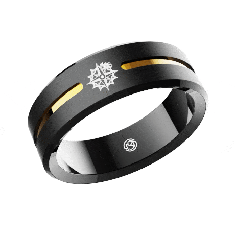 The Seven Deadly Sins 18K Gold ring features a striking black exterior complemented by a gold middle ridge, representing the balance of power and elegance.