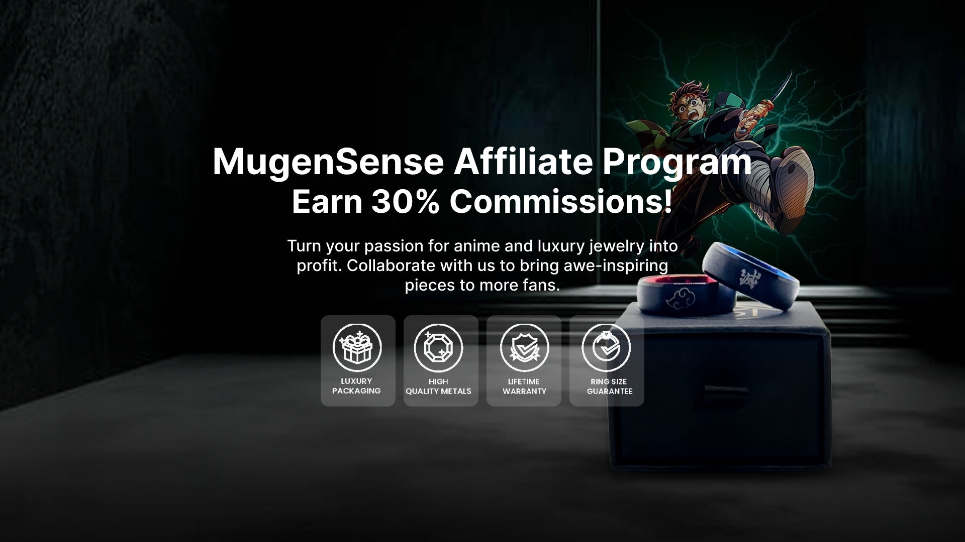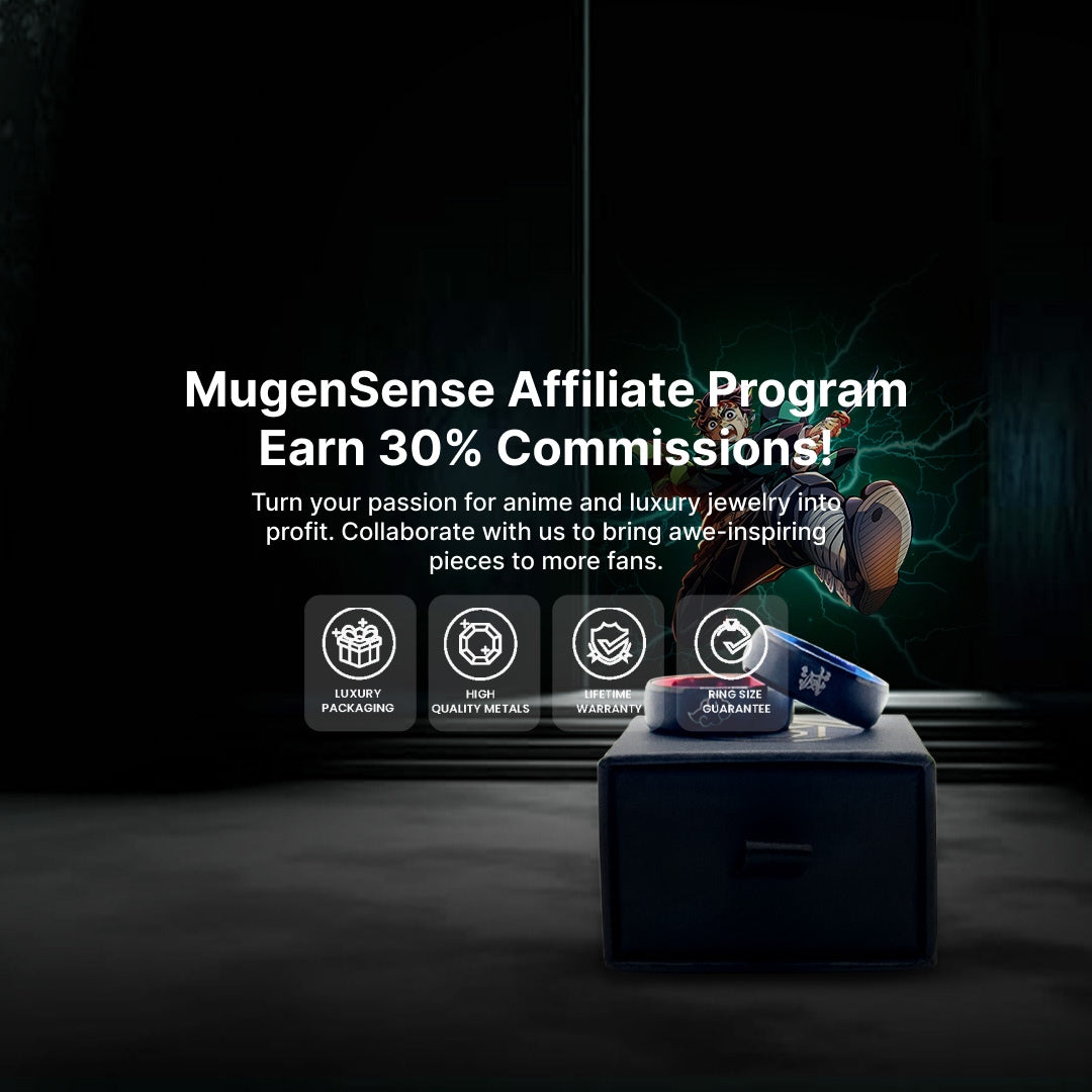 The MugenSense Affiliate Program allows you to earn a 30% commission by promoting our premium anime-inspired luxury jewelry. Simply share your unique affiliate link with your audience, and earn for every sale made through your link.